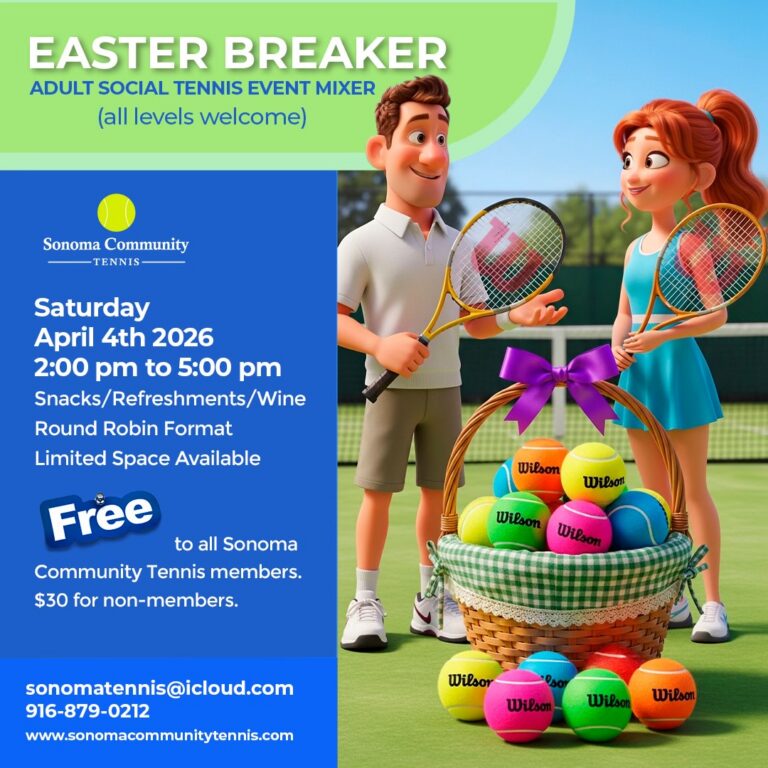 An Easter-themed adult social tennis mixer hosted by Sonoma Community Tennis, welcoming players of all skill levels for a fun,…